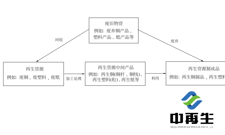 再生資源是指來源于社會(huì)生產(chǎn)和生活消費(fèi)過程的各類廢棄物,經(jīng)過回收、加工和利用等環(huán)節(jié),可以重新獲得使用價(jià)值的物質(zhì)。此外,對符合國家環(huán)??刂茦?biāo)準(zhǔn)的進(jìn)口可用作原料的固體廢物也是中國再生資源的一個(gè)重要來源。需要注意的是,再生資源與再生資源產(chǎn)品的概念有區(qū)別。例如再生銅、再生鋁、再生塑料等概念是指廢舊銅、鋁和塑料經(jīng)過回收、分揀、熔煉、拉絲造粒等環(huán)節(jié)加工而成的中間再生資源產(chǎn)品,為制造企業(yè)深加工得到再生資源的制成品提供原料,如圖所示: