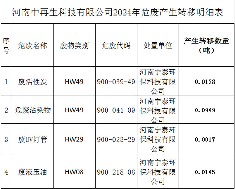 河南中再生科技有限公司2024年危廢情況公示