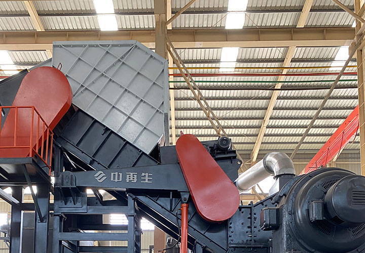 破碎線主機(jī)殼體采用特厚鋼板制造,內(nèi)襯為高錳鑄鋼件,可更換;主機(jī)轉(zhuǎn)子盤(pán)安裝于水平軸上,轉(zhuǎn)子盤(pán)圓周分布有銷(xiāo)軸,軸向懸有錘頭;主軸用滾珠軸承支撐,循環(huán)油強(qiáng)制潤(rùn)滑冷卻,并裝有溫度傳感器;進(jìn)料口裝有液壓輥筒喂料裝置,位置一高一低,同向旋轉(zhuǎn),能將大件松散物料壓扁,送入破碎腔內(nèi)。