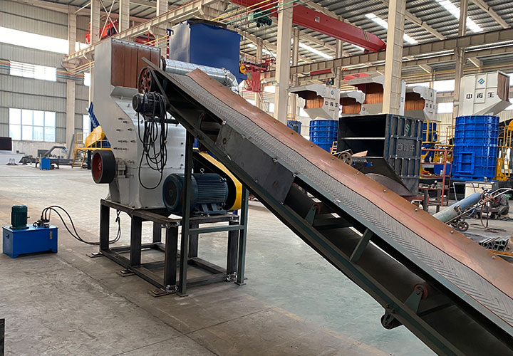 破碎線主機(jī)殼體采用特厚鋼板制造,內(nèi)襯為高錳鑄鋼件,可更換;主機(jī)轉(zhuǎn)子盤安裝于水平軸上,轉(zhuǎn)子盤圓周分布有銷軸,軸向懸有錘頭;主軸用滾珠軸承支撐,循環(huán)油強(qiáng)制潤滑冷卻,并裝有溫度傳感器;進(jìn)料口裝有液壓輥筒喂料裝置,位置一高一低,同向旋轉(zhuǎn),能將大件松散物料壓扁,送入破碎腔內(nèi)。