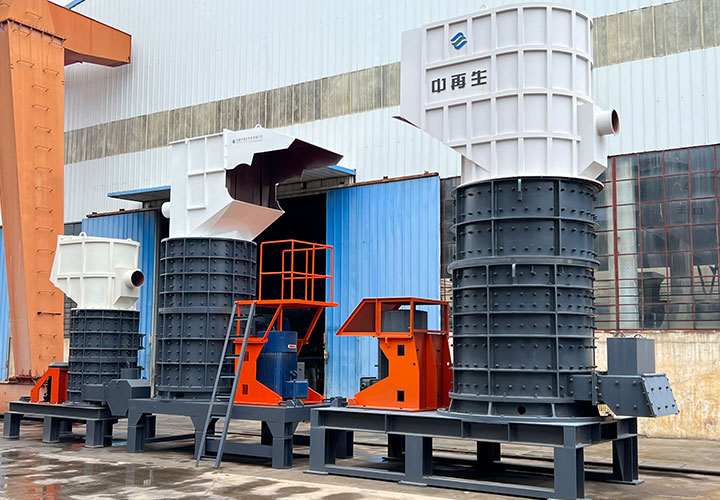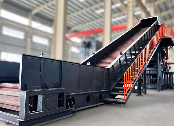 破碎線主機殼體采用特厚鋼板制造,內襯為高錳鑄鋼件,可更換;主機轉子盤安裝于水平軸上,轉子盤圓周分布有銷軸,軸向懸有錘頭;主軸用滾珠軸承支撐,循環(huán)油強制潤滑冷卻,并裝有溫度傳感器;進料口裝有液壓輥筒喂料裝置,位置一高一低,同向旋轉,能將大件松散物料壓扁,送入破碎腔內。